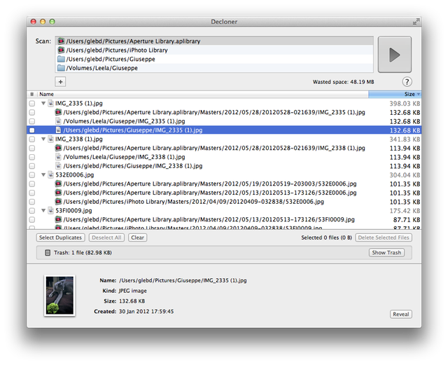 Decloner can quickly process large number of files on internal, external or network drives. It presents the list of duplicate files to the user and allows selecting and removing files into a virtual Trash for review and subsequent deletion. The user can select files manually or automatically, preserving the most relevant file copy, preview files using QuickLook feature, and reveal them in Finder.